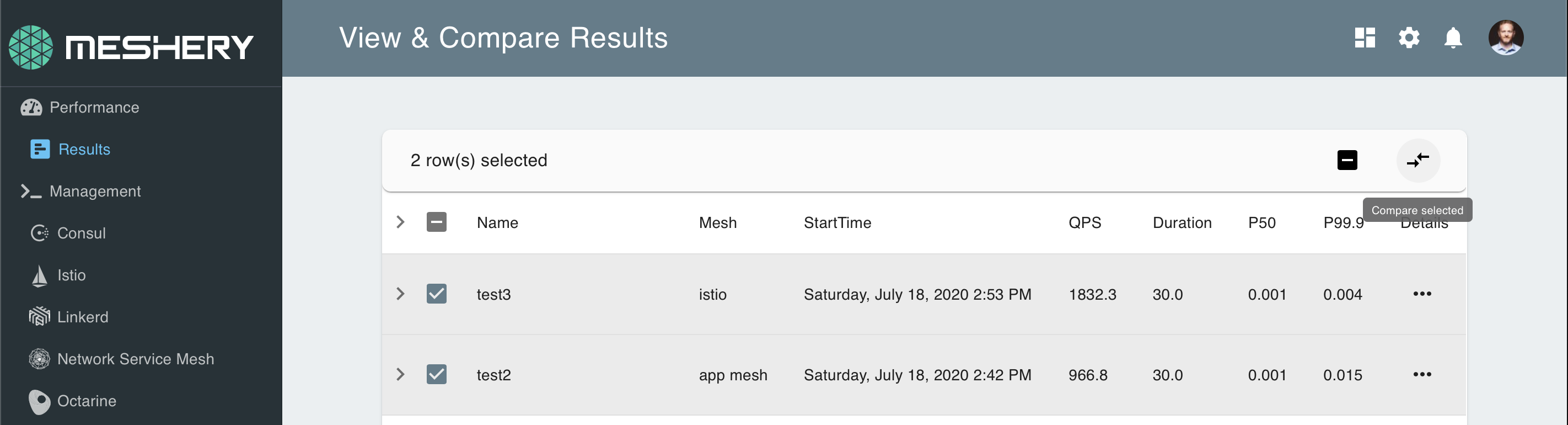 For the best experience, you should compare between two or more tests of similar configuration. Tests that are configured with a high degree of variance (e.g., one test ran for a duration of 5 minutes, while another test ran for a duration of 1 hour) will produce comparisons that are more difficult to extrapolate insights from.