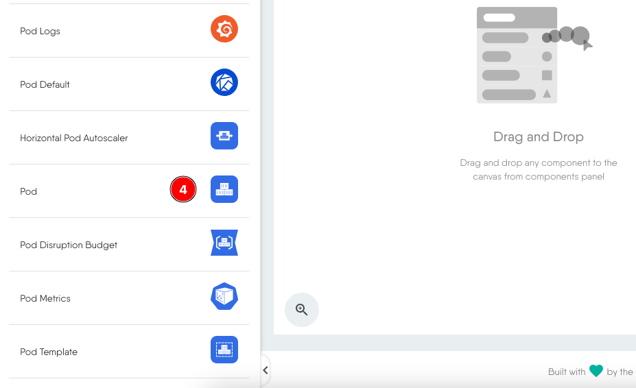 - Scroll down, select and drag the Pod component from the search results to the design canvas on the right.