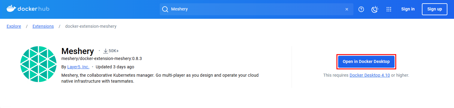 Another way to install the Meshery Docker Extension is from the Docker Hub. Navigate to the Meshery Docker Extension page and click Open in Docker Desktop to get started. Once installed, the rest of the process is same as above.