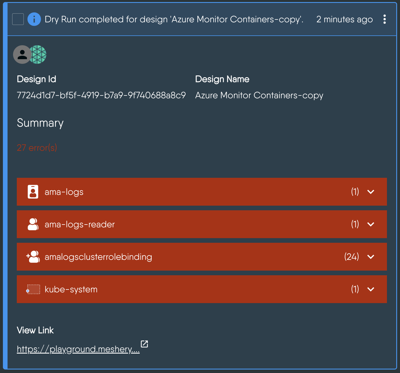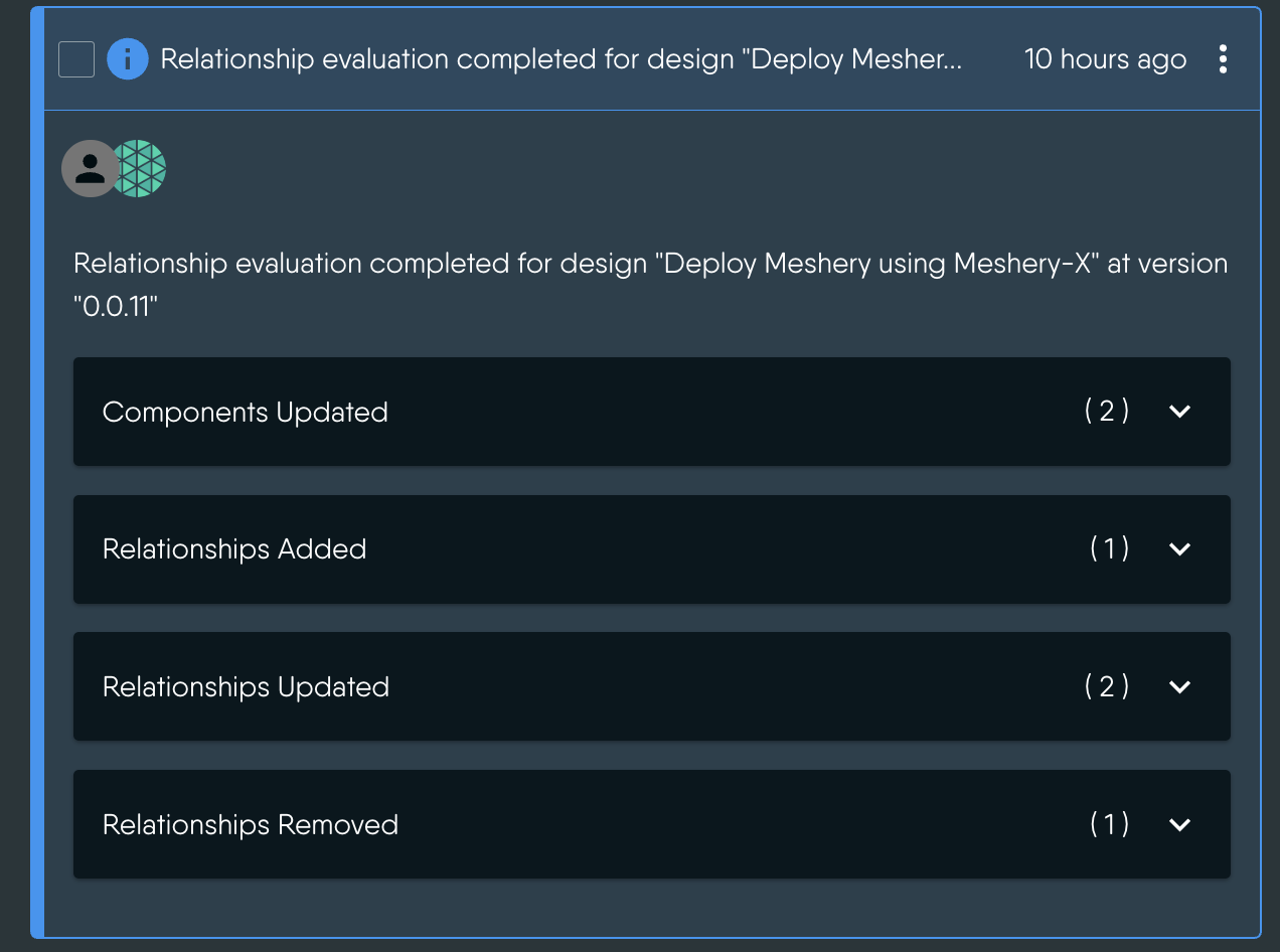 Example:"Relationship evaluation completed for design 'Deploy Meshery using Meshery-X' at version '0.0.11'"