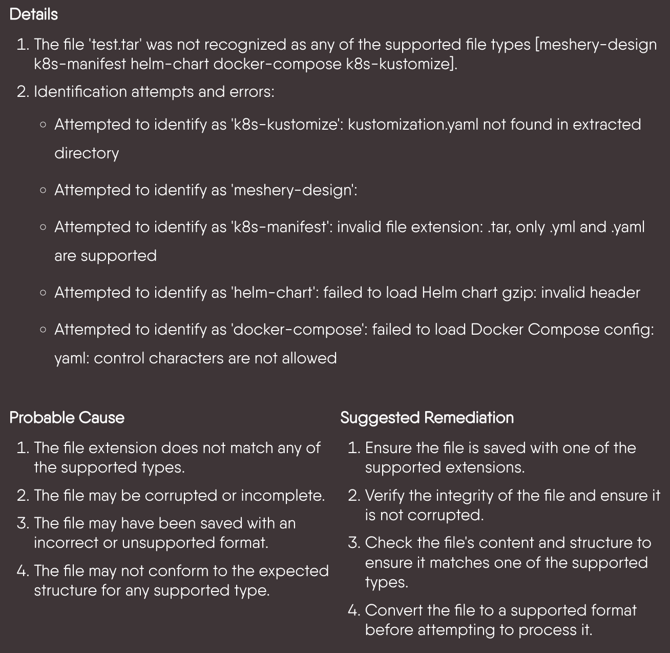 metadata(object): Contains error metadata fields such as:LongDescription: Provides details about the error.ProbableCause: Lists possible reasons for the error.SuggestedRemediation: Suggests solutions to fix the error.