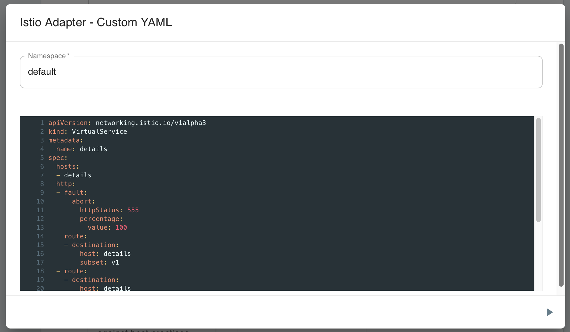 Meshery allows you to paste (or type in) any Kubernetes manifest that you would like to have applied to the cluster. This configuraiton may be new VirtualServices or new DestinationRules or other.