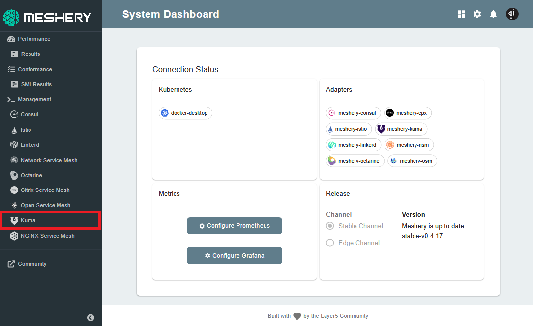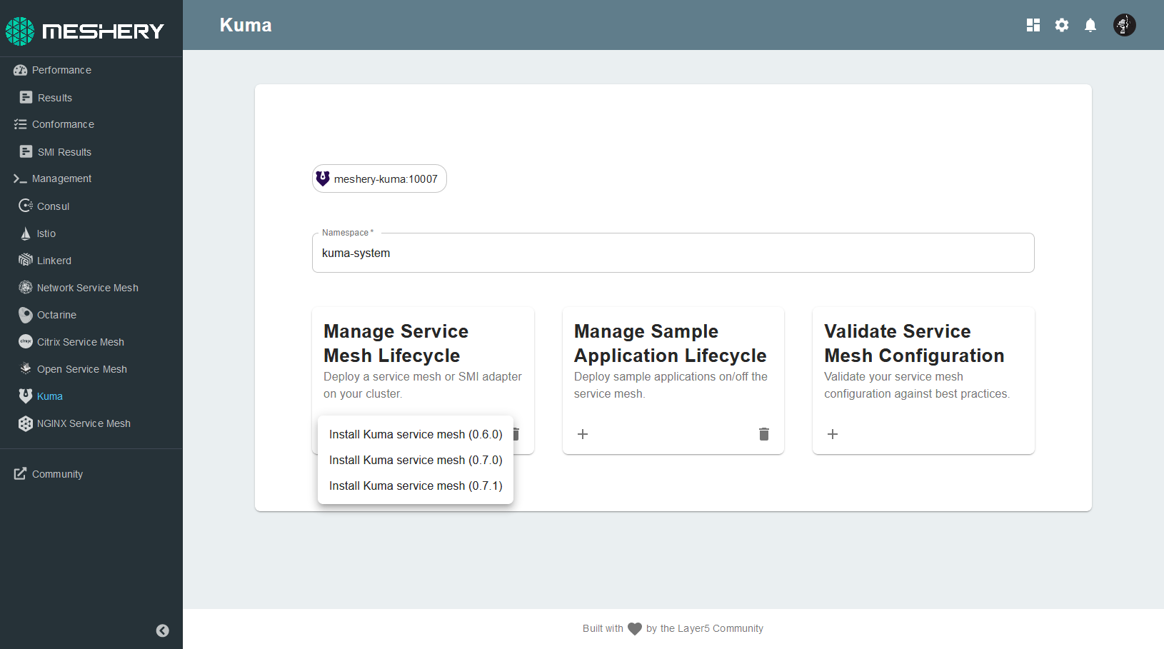The Meshery Adapter for Kuma can install v1.2.2 of Kuma infrastructure. A number of sample applications can be installed using the Meshery Adapter for Kuma.