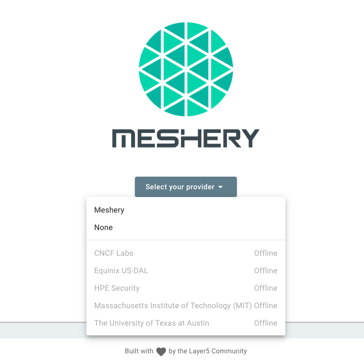 Meshery offers Providers as a point of extensibility. It has a built-in Local Provider, named “None” and supports Remote Providers that are designed to be pluggable. Remote Providers offer a point of extension to users / integrators to deliver enhanced functionality such as authentication and authorization, using Meshery as a platform.