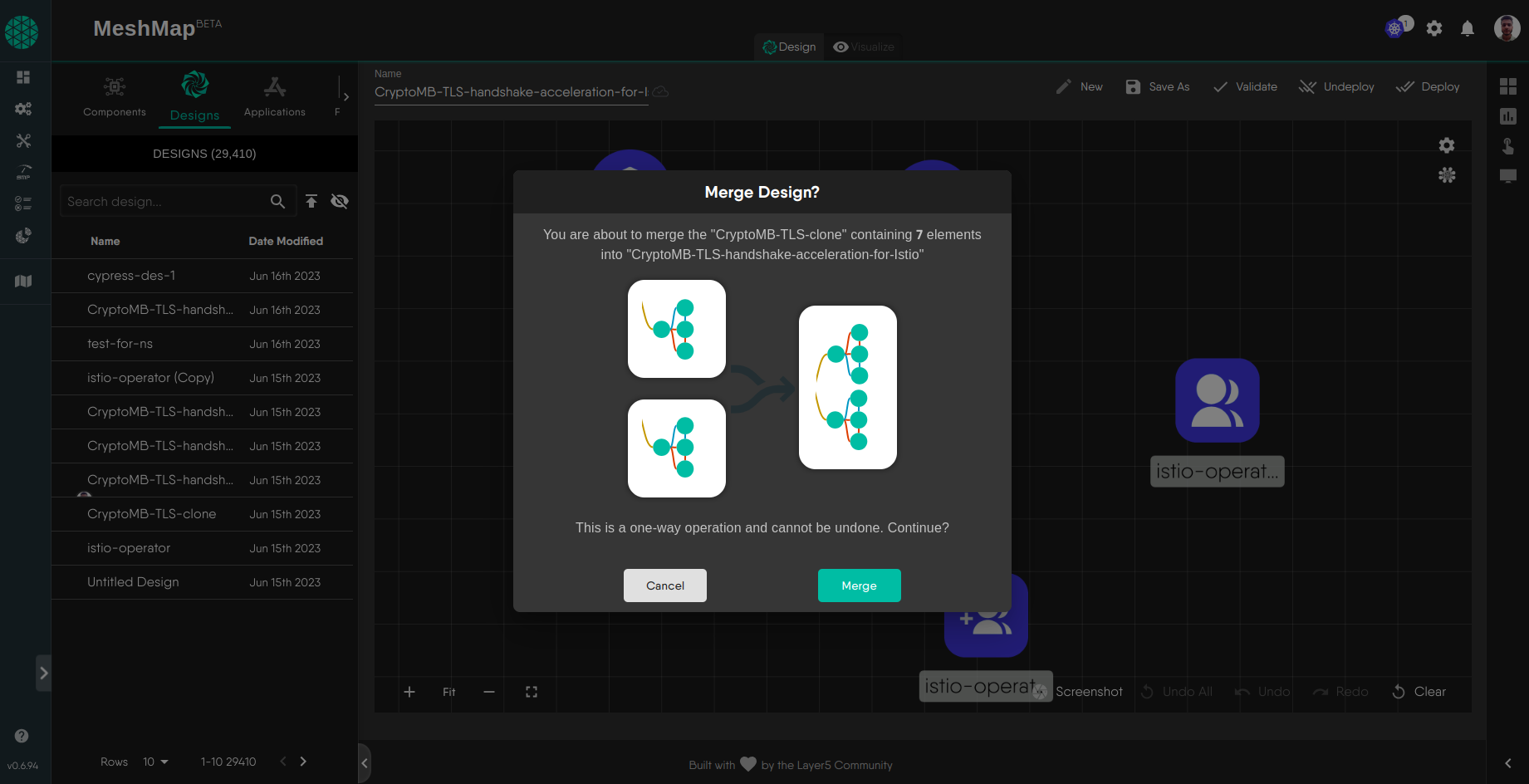 Mesheryβs Design merge feature provides a practical solution for infrastructure engineers seeking to seamlessly integrate changes across different infrastructure configurations. This functionality proves invaluable in collaborative projects where version control and efficiency are paramount.
